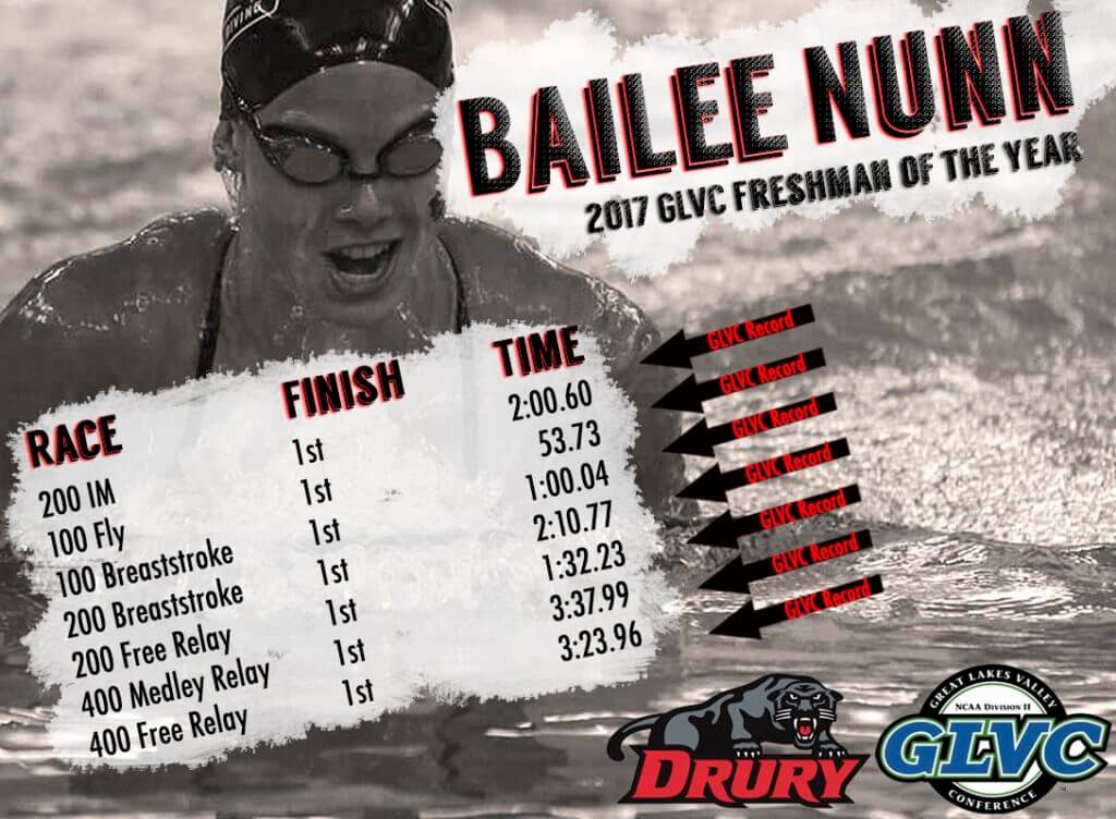 Congratulations to Bailee Nunn on her outstanding performance over the weekend at the GLVC Tournament. Bailee swam in 7 events
