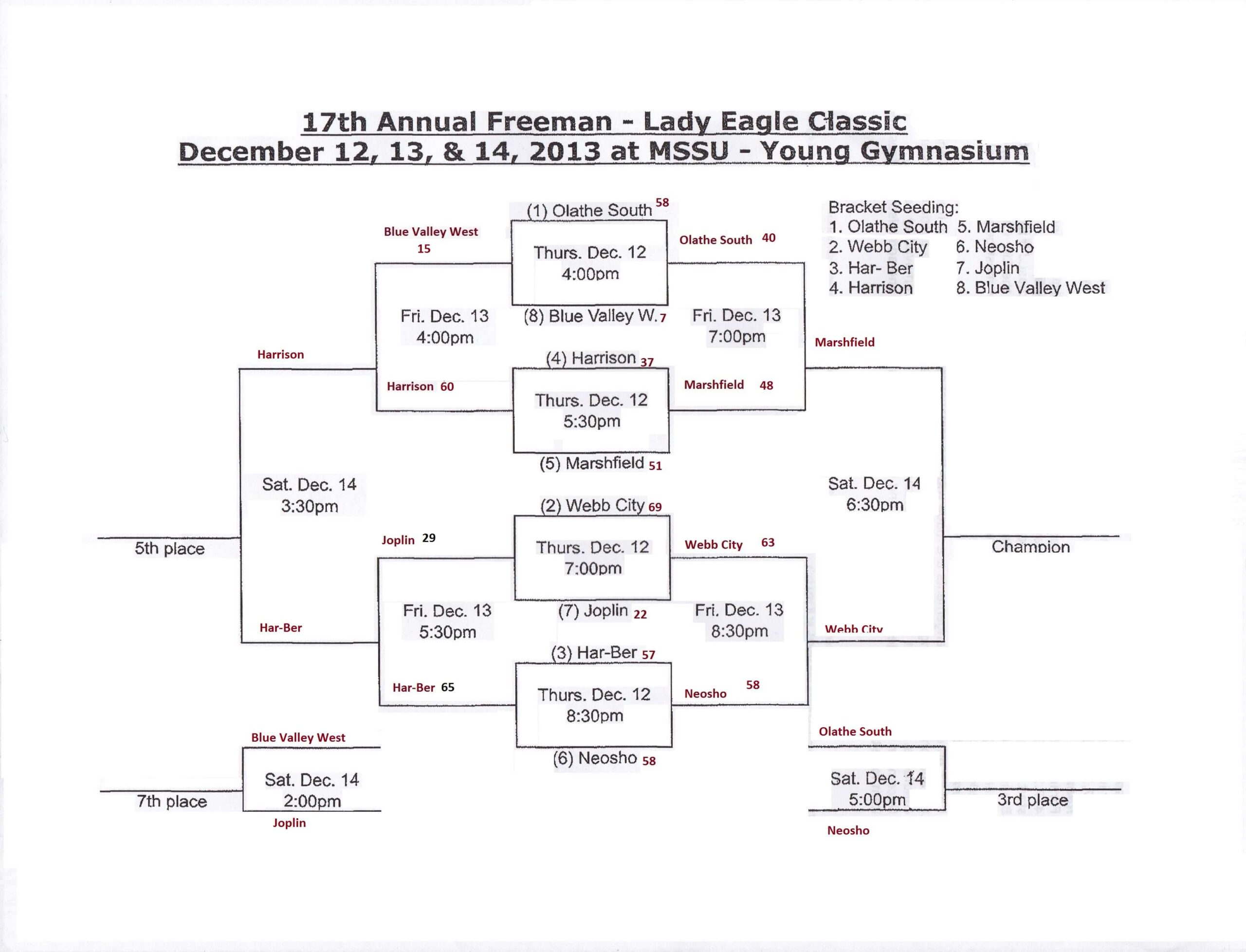 Marshfield seeded 5th beat the #4 seed Harrison Arkansas on Thursday by the score of 51-37.  Tonight we upset the #1 seed Olathe South (KS) 48 to 40.